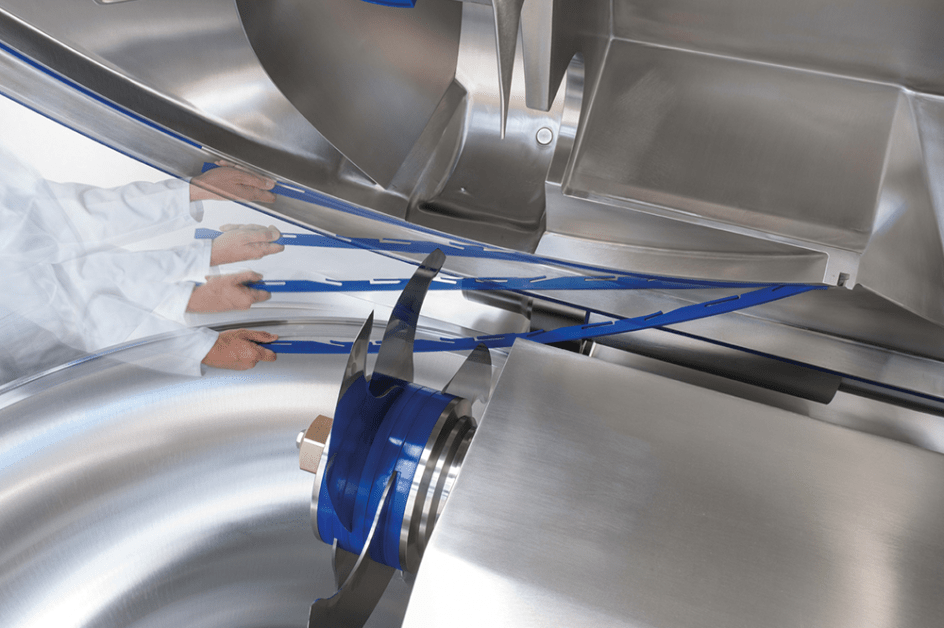 The area between the cutter bowl and the vacuum chamber does not need a seal at all, making replacement, wear, and risks of contamination a thing of the past. In addition, there are large cleaning flaps in the vacuum vessel that can be opened without tools- allowing easy access with the cleaning lance. The visual inspection of the cleaning results can therefore be carried out safely, quickly and reliably. Hygiene and product safety are guaranteed by the simple and hygienically reliable cleaning.
