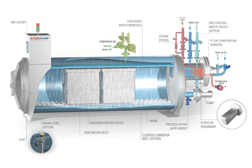 The retorts, also known as autoclaves, are designed to both pasteurise and sterilise pre-packaged products. They employ a process in which heated water cascades over the products while the vessel is subjected to pressure. This means that products such as ready meals can be either pasteurised or sterilised without any adverse effects on the packaging.